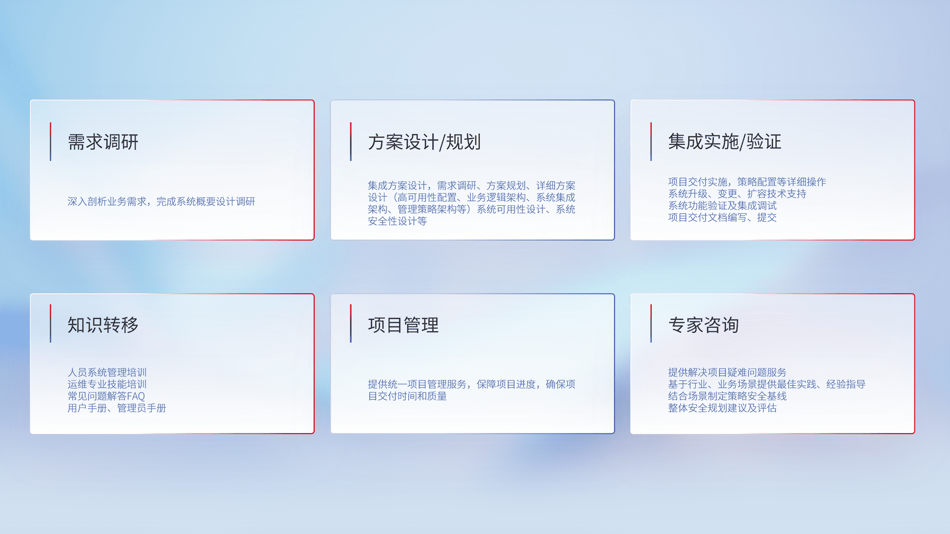 针对客户行业特性,,,将宏观的安全战略和需求,,,通过专业的交付服务,,,,实现项目落地,,,,为客户提供标准规范的集成交付服务。。。。
